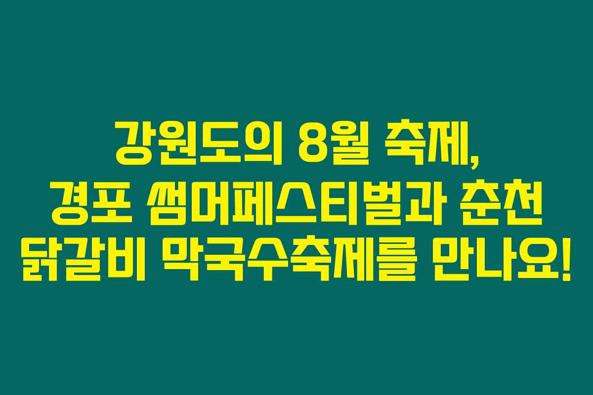 강원도는 여름에 찾은 여행자들에게 놀라운 축제와 함께 환상적인 추억을 선사합니다. 특히 8월에는 경포 썸머페스티벌과 춘천 닭갈비 막국수축제가 열리는데요, 이 두 축제는 각각의 매력으로 여러분을 초대합니다. 아래를 읽어보시면 이들 축제의 흥미로운 내용과 강원도의 맛있는 음식 문화를 알아보실 수 있을 거예요!