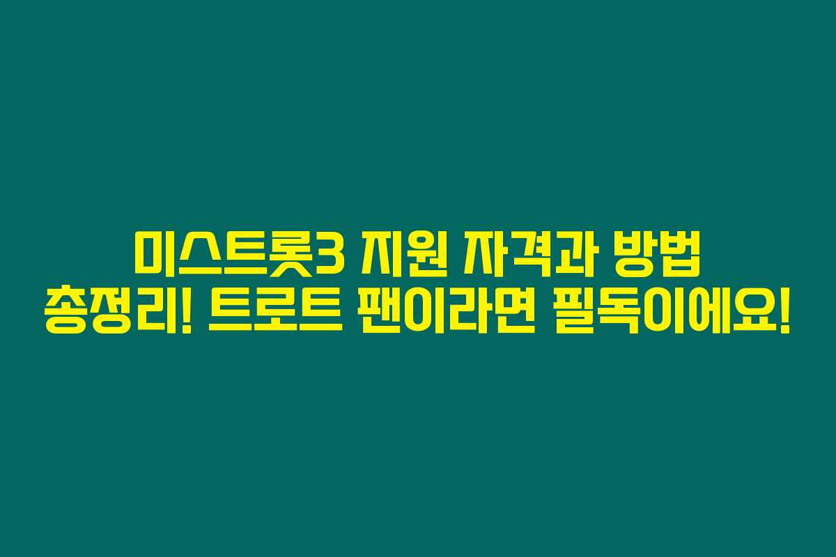 트로트의 열풍이 계속 이어지고 있는 요즘, 여러분은 혹시 미스트롯3 지원 소식은 들었나요? 미스트롯3의 참가자 모집이 시작되었답니다. 혹시 지원 자격이나 방법 때문에 고민하고 계신가요? 그러면 아래를 읽어보시면 해당 정보가 쏙 들어오실 거예요! 특히 트로트를 사랑하는 분들이라면 놓치지 말고 자세히 확인해보세요.